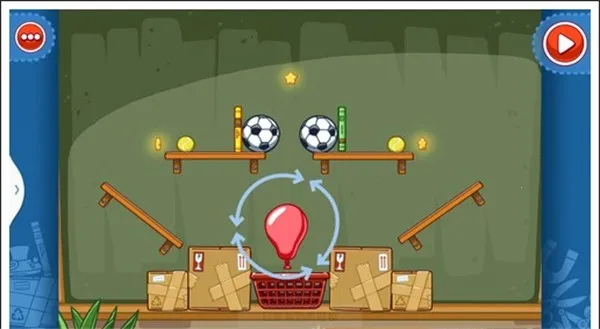 我们只需要将两个木板凳放在斜放在两侧,气球放在足球下面,这样使气球飞上去,碰到足球这样就能获得星星。