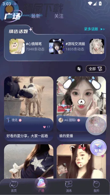 3. 多元话题易交友:在广场有多元话题,能结识同好。用户可参与各种热门讨论,分享生活点滴,倾诉内心想法,轻松找到志同道合的伙伴。