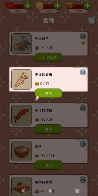 3.接下来选择食物来填饱肚子,当然由于现在没有钱,只能够吃免费的蝗虫来果腹。