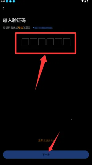 2、输入收到的短信验证码,再次点击下一步。